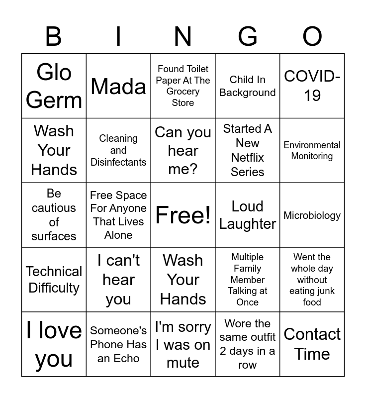 This bingo card has a free space and 24 words: I can't hear you, Someone's Phone Has an Echo, Can you hear me?, I love you, COVID-19, Glo Germ, Wash Your Hands, Mada, Loud Laughter, Wash Your Hands, Started A New Netflix Series, Be cautious of surfaces, Multiple Family Member Talking at Once, Went the whole day without eating junk food, Cleaning and Disinfectants, Wore the same outfit 2 days in a row, Microbiology, Found Toilet Paper At The Grocery Store, Environmental Monitoring, Free Space For Anyone That Lives Alone, Contact Time, Technical Difficulty, Child In Background and I'm sorry I was on mute.