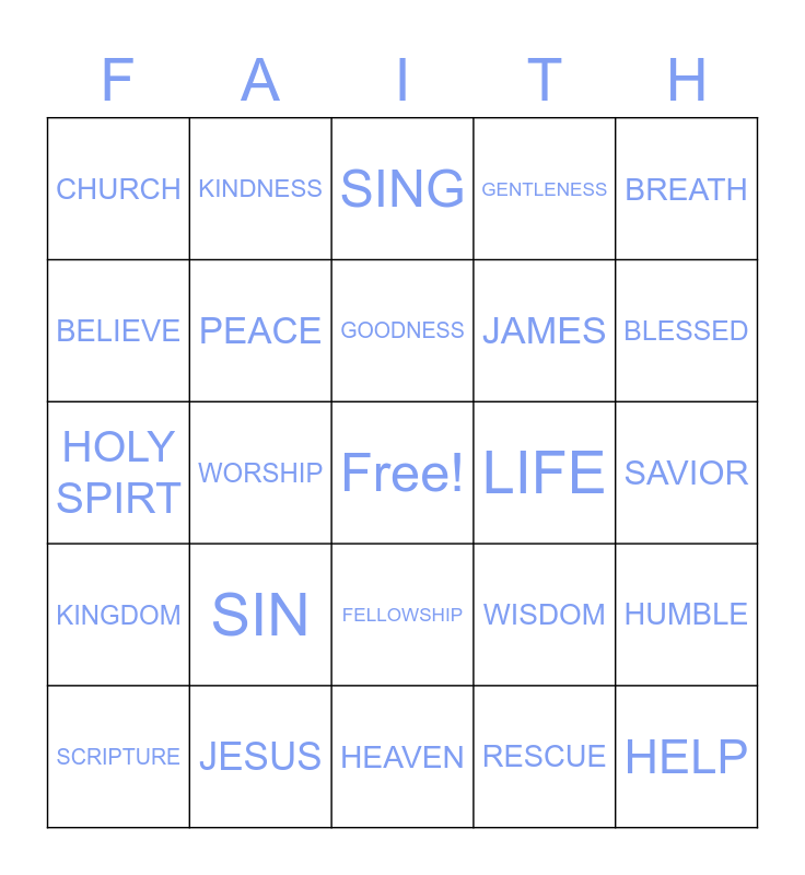 This bingo card has a free space and 59 words: JOY, JESUS, BIBLE, TRUTH, HUMBLE, LOVE, PEACE, PASTOR, LIFE, BAPTISM, BELIEVE, PATIENCE, JAMES, EPHESIANS, GOD, KINDNESS, GOODNESS, GENTLENESS, SELF CONTROL, HOLY SPIRT, WORSHIP, SING, PRAISE, SAVIOR, CROSS, MERCY, FELLOWSHIP, STUDY, BREATH, SON, DEVOTION, ETERNAL, DISCIPLE, CREATION, CHURCH, TRUST, PRAY, WISDOM, RESURRECTION, KINGDOM, FORGIVE, HEAVEN, RESCUE, HOPE, FINSHED, FAMILY, FRUIT, ROCK, BLESSED, SCRIPTURE, APOSTLE, LORD, CONQUERED, HELP, REDEEM, SIN, SERVANT, SAVED and VICTORY.