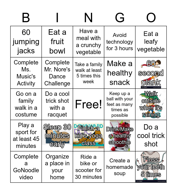 This bingo card has 6 images, a free space and 24 words: Sleep 30 minutes early, Organize a place in your home, Take a family walk at least 5 times this week, Complete a GoNoodle video, Eat a leafy vegetable, 60 jumping jacks, Complete Ms. Music's Activity, Eat a fruit bowl, Keep up a ball with your feet as many times as possible, Finish a kid's yoga class, Make a healthy snack, Go on a family walk in a costume, Drink/Make a healthy smoothie, Do a cool trick shot, Complete Mr. Nore's Dance Challenge, Create a homemade soup, Walk outside when it's raining, Have a meal with a crunchy vegetable, 60 second plank, Do a cool trick shot with a racquet, Floss your teeth 5 times, Play a sport for at least 45 minutes, Avoid technology for 3 hours and Ride a bike or scooter for 30 minutes.