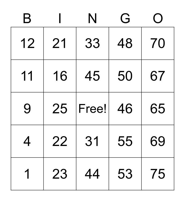 This bingo card has a free space and 24 words: 1, 22, 45, 53, 70, 12, 21, 33, 46, 65, 9, 16, 55, 69, 11, 23, 44, 48, 67, 4, 25, 31, 50 and 75.