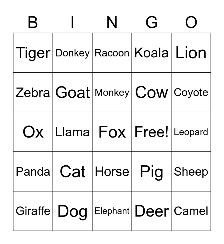 This bingo card has a free space and 24 words: Cat, Dog, Monkey, Giraffe, Lion, Tiger, Zebra, Donkey, Free!, Horse, Cow, Ox, Pig, Sheep, Goat, Deer, Leopard, Racoon, Coyote, Llama, Camel, Panda, Koala and Elephant.