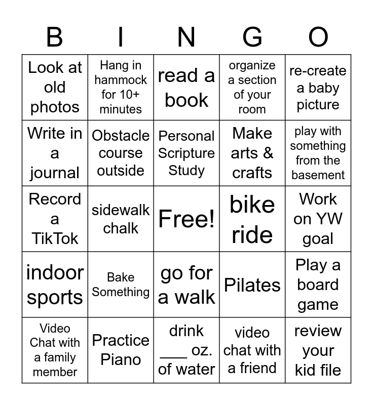 This bingo card has a free space and 24 words: Bake Something, Practice Piano, Personal Scripture Study, Video Chat with a family member, re-create a baby picture, Look at old photos, Write in a journal, Hang in hammock for 10+ minutes, bike ride, go for a walk, Make arts & crafts, Record a TikTok, Pilates, Play a board game, Obstacle course outside, video chat with a friend, Work on YW goal, read a book, play with something from the basement, sidewalk chalk, review your kid file, indoor sports, organize a section of your room and drink ___ oz. of water.