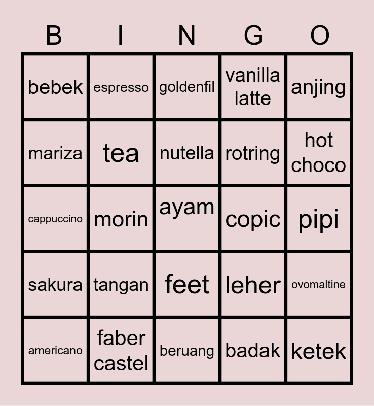 This bingo card has a free space and 24 words: tangan, faber castel, nutella, americano, anjing, bebek, mariza, espresso, copic, feet, rotring, cappuccino, leher, ovomaltine, tea, badak, pipi, goldenfil, hot choco, morin, ketek, sakura, vanilla latte and beruang.