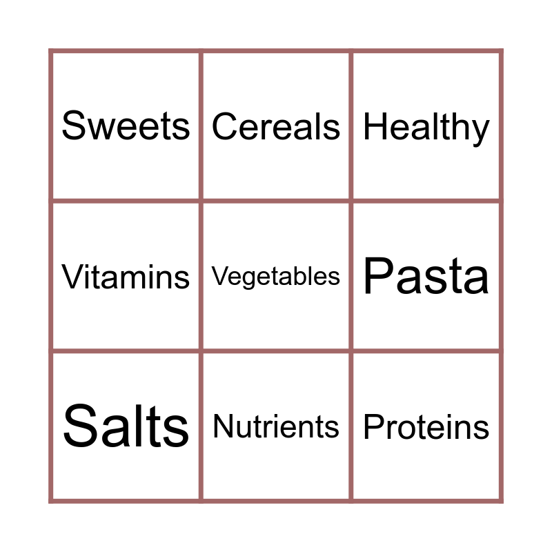 This bingo card has 23 words: Pyramid, Carbohydrate, Nutrients, Dairy, Vegetables, Sweets, Pasta, Cereals, Rice, Eggs, Fish, Proteins, Legumes, Meats, Oils, Milk, Healthy, Diet, Salts, Water, Vitamins, Grains and Hunger.