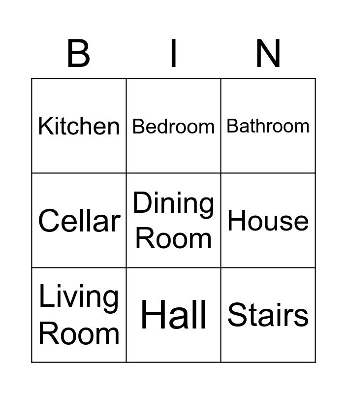 This bingo card has a free space and 8 words: House, Bathroom, Bedroom, Living Room, Kitchen, Stairs, Cellar and Hall.