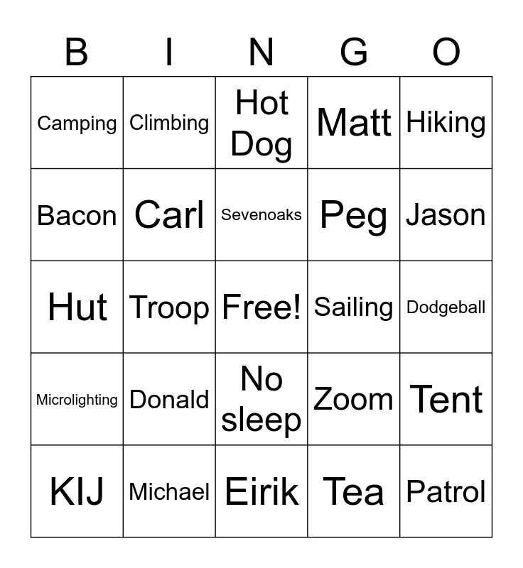 This bingo card has a free space and 28 words: Tent, Bivvy, Peg, Tea, Bacon, Hot Dog, Climbing, Microlighting, Sailing, KIJ, Hut, Matt, Michael, Eirik, Jason, Rob, Donald, Carl, Sevenoaks, No sleep, Camping, Badges, Patrol, Troop, Dodgeball, Zoom, Hiking and Scout.