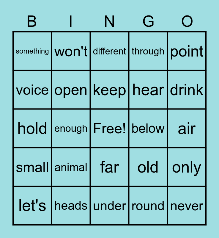 This bingo card has a free space and 24 words: animal, heads, keep, let's, point, something, voice, won't, below, far, hear, hold, old, only, open, round, air, different, drink, enough, never, small, through and under.