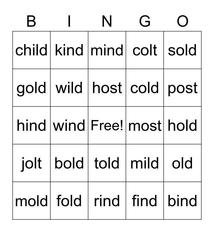 This bingo card has a free space and 24 words: bold, fold, host, mold, sold, child, gold, kind, most, told, cold, hind, mild, old, wild, find, hold, mind, post, wind, bind, jolt, colt and rind.