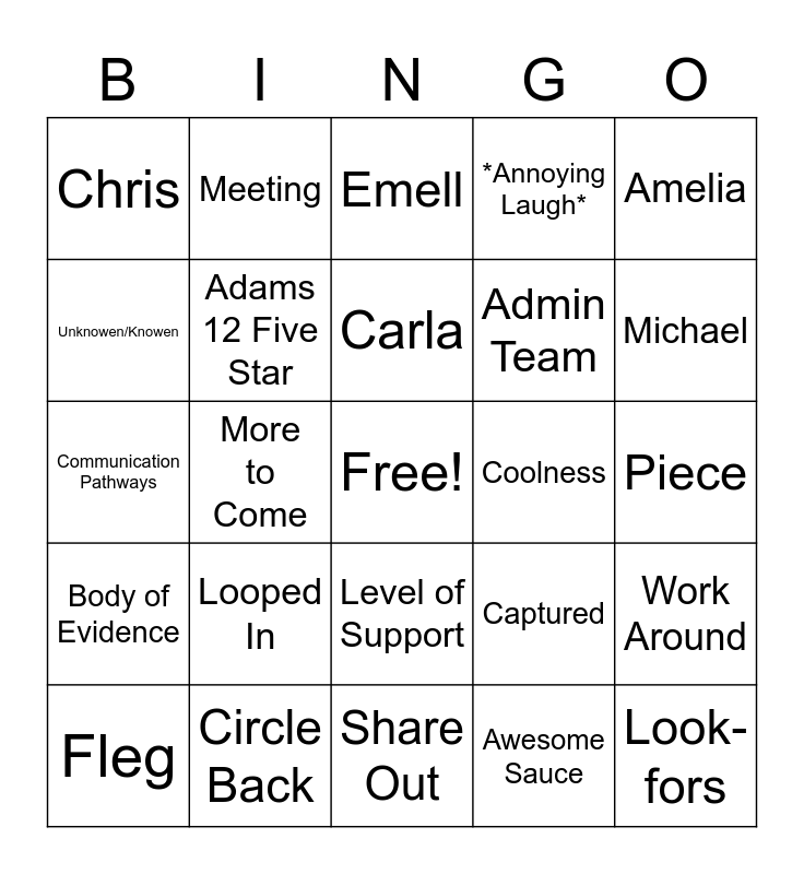 This bingo card has a free space and 28 words: Work Around, At my previous school..., Admin Team, Awesome Sauce, Unknowen/Knowen, Emell, Meeting, Body of Evidence, Coolness, Fleg, Communication Pathways, *Annoying Laugh*, Circle Back, Share Out, Michael, Rob, Looped In, Adams 12 Five Star, Carla, Level of Support, Chris, Wonder-ifs, Look-fors, More to Come, Piece, Captured, Amelia and Wordsmith.