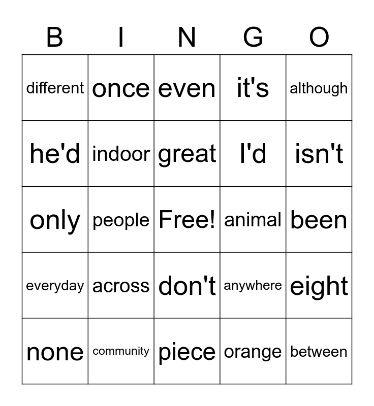 This bingo card has a free space and 24 words: across, community, great, none, although, different, he'd, once, animal, don't, I'd, only, anywhere, eight, indoor, orange, been, even, isn't, people, between, everyday, it's and piece.