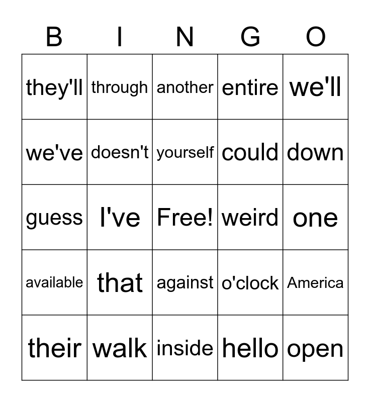 This bingo card has a free space and 24 words: that, walk, yourself, their, we'll, they'll, we've, through, weird, against, could, guess, o'clock, America, doesn't, hello, one, another, down, I've, open, available, entire and inside.