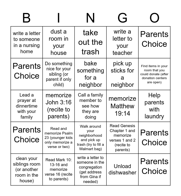 This bingo card has 25 words: Read and memorize Psalm 23 (younger kids only memorize a verse or two), write a letter to someone in the congregation (get address from Gina if needed), bake something for a neighbor, clean your siblings room (or another room in the house), Parents Choice, write a letter to someone in a nursing home, Parents Choice, dust a room in your house, memorize Matthew 19:14, Walk around your neighborhood and pick up trash (try to fill a Walmart bag), pick up sticks for a neighbor, Lead a prayer at dinnertime with your family, Read Genesis Chapter 1 and memorize verses 1 and 2 (recite to parents), Parents Choice, Do something nice for your sibling (or parent if only child), Parents Choice, Help parents with laundry, take out the trash, Find items in your room that you could donate (after donation centers are open), memorize John 3:16 (recite to parents), Call a family member to see how they are doing, Read Mark 10: 13-16 and memorize verse 16 (recite to parents), Parents Choice, write a letter to your teacher and Unload dishwasher.