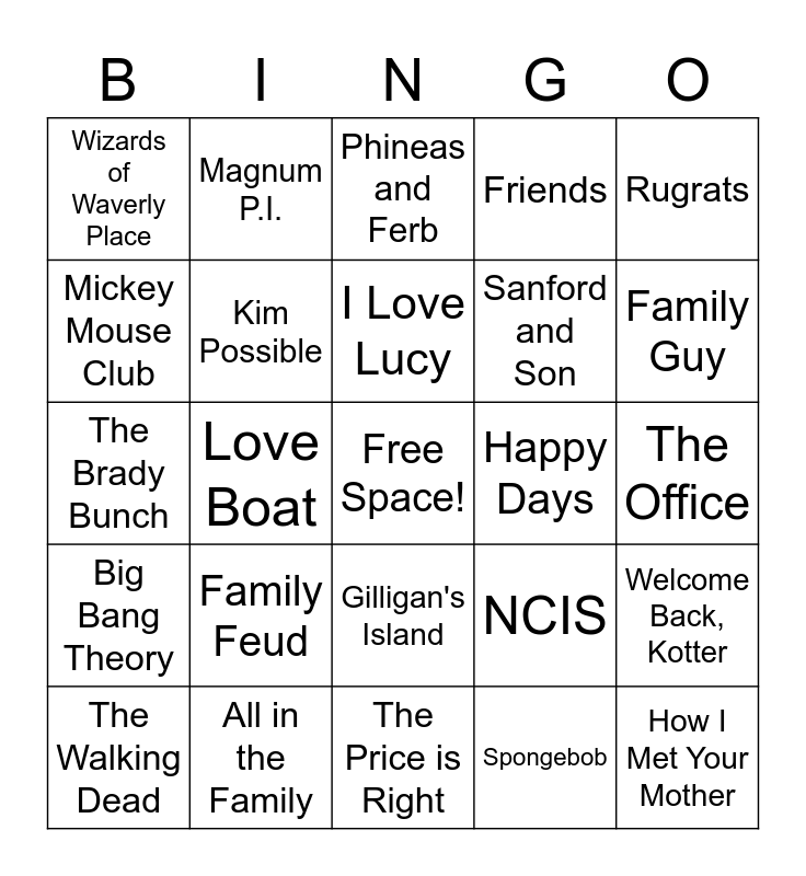 This bingo card has a free space and 69 words: The Fresh Prince of Bel-Air, The Office, Parks and Rec, George Lopez, All in the Family, Cheers, Friends, The Jeffersons, Rugrats, The Flinstones, Welcome Back, Kotter, Suite Life of Zack and Cody, Wizards of Waverly Place, Phineas and Ferb, Fantasy Island, Love Boat, Gilligan's Island, Sanford and Son, Three's Company, Big Bang Theory, Happy Days, NCIS, Family Guy, The Simpsons, Breaking Bad, Curb Your Enthusiasm, M*A*S*H, Seinfeld, Spongebob, Chips, Magnum P.I., The "A" Team, Hill Street Blues, The Jetsons, Clifford The Big Red Dog, Caillou, Pretty Little Liars, Malcom in the Middle, Mickey Mouse Club, American Dad, Family Feud, How I Met Your Mother, Jeopardy, Two and a Half Men, Bob's Burgers, The Walking Dead, Bill Nye the Science Guy, Game of Thrones, Boy Meets World, Kim Possible, I Love Lucy, Drake and Josh, That 70s Show, The Price is Right, Lizzie McGuire, Scooby-Doo, Victorious, CSI: Miami, Sesame Street, The Brady Bunch, Dallas, Dynasty, Knots Landing, Little House on the Prairie, Mr. Rogers, Growing Pains, Who's the Boss?, iCarly and That's So Raven.