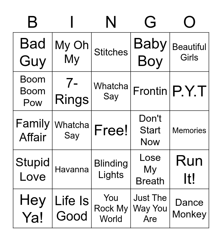 This bingo card has a free space and 29 words: Hey Ya!, Bootylicious, Whatcha Say, Girls Like You, Bad Guy, Stitches, 7-Rings, Havanna, Don't Start Now, Life Is Good, Memories, Dance Monkey, You Rock My World, Just The Way You Are, P.Y.T, Daft Punk, Blinding Lights, Stupid Love, Beautiful Girls, Family Affair, Lose My Breath, Fighter, Frontin, Boom Boom Pow, Baby Boy, My Oh My, Run It!, Whatcha Say and Closer.