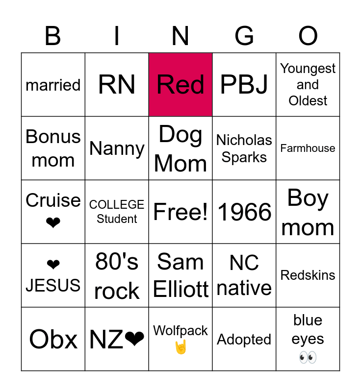 This bingo card has a free space and 24 words: Obx, 80's rock, Dog Mom, Adopted, Youngest and Oldest, married, RN, Red, 1966, Boy mom, Cruise❤, Nanny, NC native, Redskins, Bonus mom, NZ❤, Wolfpack🤘, PBJ, Farmhouse, ❤JESUS, COLLEGE Student, Sam Elliott, Nicholas Sparks and blue eyes 👀.