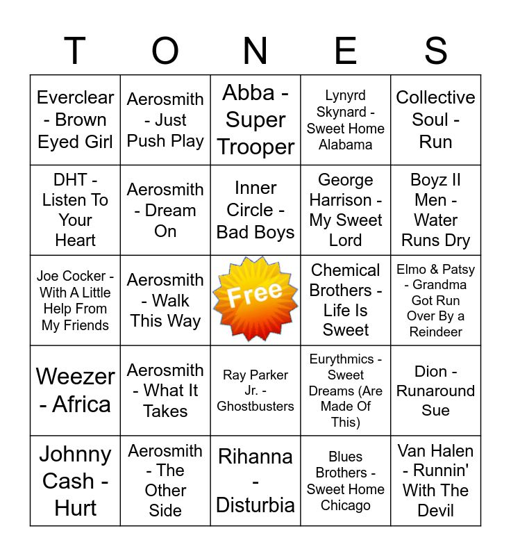 This bingo card has a free space and 75 words: 10,000 Maniacs - Because The Night, Aerosmith - Amazing, Abba - Super Trooper, Black Sabbath - Sweet Leaf, Beyonce - Run The World (Girls), Adele - Make You Feel My Love, Aerosmith - Crazy, Deep Blue Something - Breakfast At Tiffany's, Blues Brothers - Sweet Home Chicago, Blues Traveler - Run Around, Alien Ant Farm - Smooth Criminal, Aerosmith - Cryin, Chemical Brothers - Life Is Sweet, Boyz II Men - Water Runs Dry, Counting Crows & Vanessa Carlton - Big Yellow Taxi, Aerosmith - Dream On, Elton John - Rocket Man, Eurythmics - Sweet Dreams (Are Made Of This), Bryan Adams - Run To You, DHT - Listen To Your Heart, Aerosmith - Dude Looks Like A Lady, Inner Circle - Bad Boys, George Harrison - My Sweet Lord, Collective Soul - Run, Everclear - Brown Eyed Girl, Aerosmith - I Don't Want To Miss A Thing, Johnny Cash - I Walk the Line, Guns N Roses - Sweet Child O' Mine, Del Shannon - Runaway, Jimi Hendrix - All Along The Watchtower, Aerosmith - Jaded, Kenny Loggins - Footloose, Gwen Stefani featuring Akon - The Sweet Escape, Dion - Runaround Sue, Joe Cocker - With A Little Help From My Friends, Aerosmith - Just Push Play, Psychedelic Furs - Pretty In Pink, James Taylor - How Sweet It Is, Elmo & Patsy - Grandma Got Run Over By a Reindeer, Johnny Cash - Hurt, Aerosmith - Livin' On The Edge, Queen - Bohemian Rhapsody, Jimmy Eat World - Sweetness, Hoobastank - Running Away, Lenny Kravitz - American Woman, Aerosmith - Love In An Elevator, Ray Parker Jr. - Ghostbusters, Lynyrd Skynard - Sweet Home Alabama, Jackson Browne - Running On Empty, Red Hot Chili Peppers - Higher Ground, Aerosmith - Same Old Song And Dance, Rihanna - Disturbia, Neil Diamond - Sweet Caroline, Lady Antebellum - I Run To You, Reel Big Fish - Take On Me, Aerosmith - Sweet Emotion, Rod Stewart - Forever Young, Sweet - Ballroom Blitz, Muse - Time Is Running Out, Rufus Wainwright - Hallelujah, Aerosmith - The Other Side, Roy Orbison - Oh Pretty Woman, The Verve - Bitter Sweet Symphony, OneRepublic - Love Runs Out, The Fugees - Killing Me Softly, Aerosmith - Walk This Way, The Beatles - Can't Buy Me Love, U2 - The Sweetest Thing, Paul McCartney & Wings - Band on the Run, Weezer - Africa, Aerosmith - What It Takes, The Eagles - Desperado (Live), Velvet Underground - Sweet Jane, Van Halen - Runnin' With The Devil and Don McLean - American Pie.