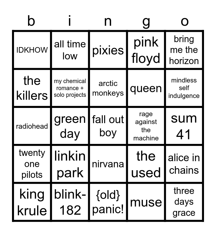 This bingo card has 25 words: twenty one pilots, blink-182, fall out boy, muse, bring me the horizon, IDKHOW, all time low, pixies, rage against the machine, alice in chains, the killers, my chemical romance + solo projects, {old} panic!, the used, mindless self indulgence, king krule, green day, arctic monkeys, queen, sum 41, radiohead, linkin park, nirvana, pink floyd and three days grace.