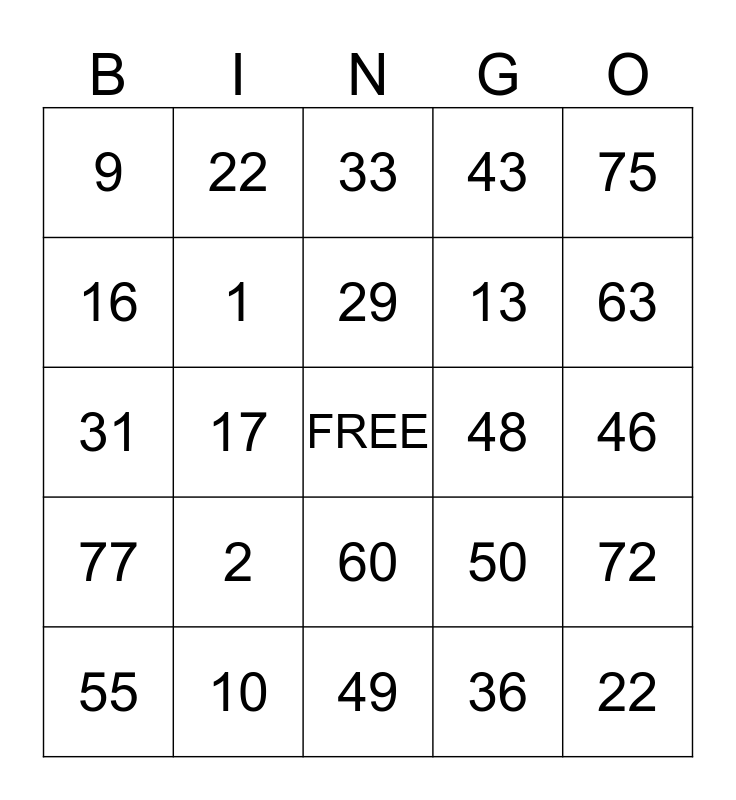 This bingo card has a free space and 24 words: 2, 10, 29, 55, 75, 9, 16, 22, 48, 60, 13, 31, 50, 72, 1, 36, 46, 33, 63, 17, 22, 77, 43 and 49.