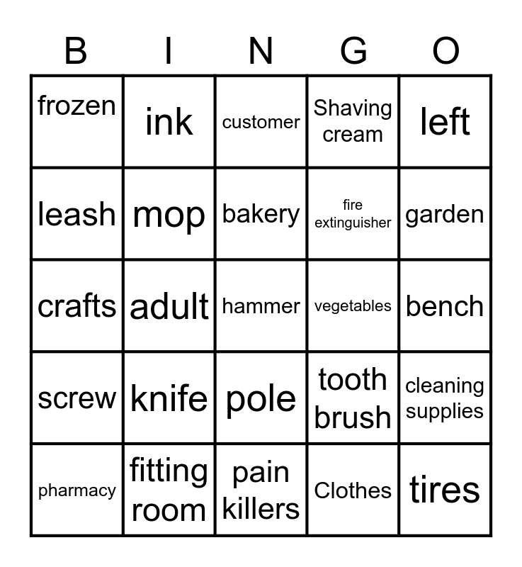 This bingo card has a free space and 29 words: restroom, fitting room, customer, right, left, frozen, mop, bakery, vegetables, cleaning supplies, pharmacy, adult, Clothes, tires, crafts, pacifier, pain killers, tooth brush, garden, screw, knife, coats, fire extinguisher, bench, leash, ink, pole, Shaving cream and Fan.
