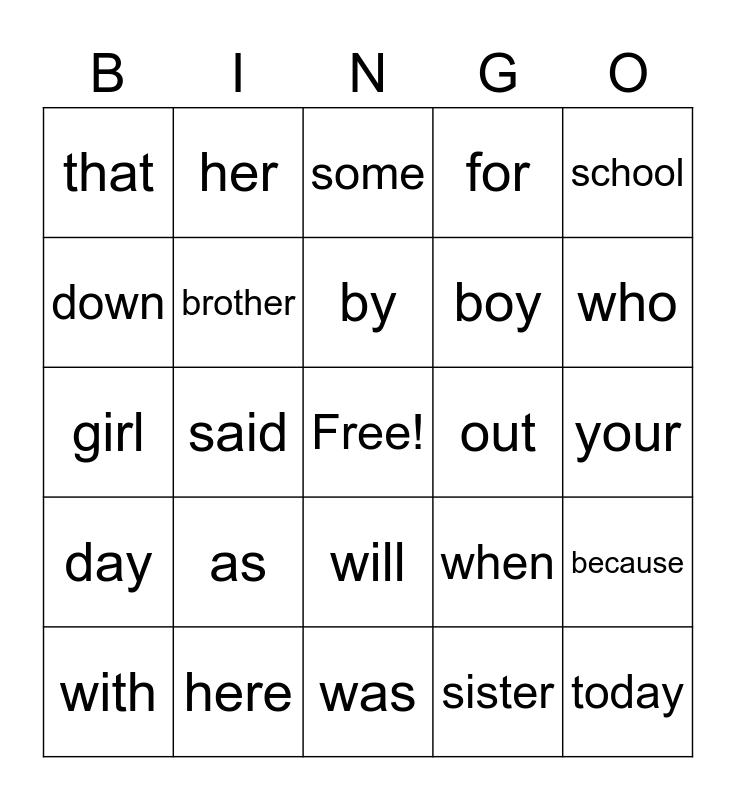 This bingo card has a free space and 24 words: as, here, by, with, school, that, down, her, out, will, boy, girl, when, because, brother, sister, your, some, who, said, today, day, for and was.