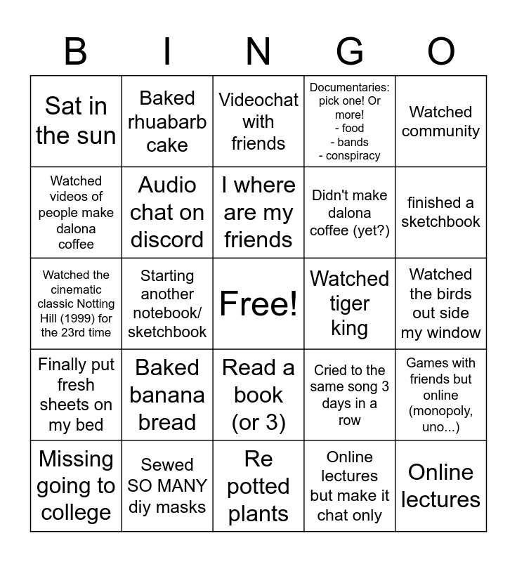 This bingo card has a free space and 24 words: Baked banana bread, Sewed SO MANY diy masks, I where are my friends, Missing going to college, Watched community, Sat in the sun, Watched videos of people make dalona coffee, Baked rhuabarb cake, Watched tiger king, Read a book (or 3), Didn't make dalona coffee (yet?), Watched the cinematic classic Notting Hill (1999) for the 23rd time, Cried to the same song 3 days in a row, Games with friends but online (monopoly, uno...), Audio chat on discord, Online lectures but make it chat only, Watched the birds out side my window, Videochat with friends, finished a sketchbook, Starting another notebook/ sketchbook, Online lectures, Finally put fresh sheets on my bed, Documentaries: pick one! Or more! - food - bands - conspiracy and Re potted plants.