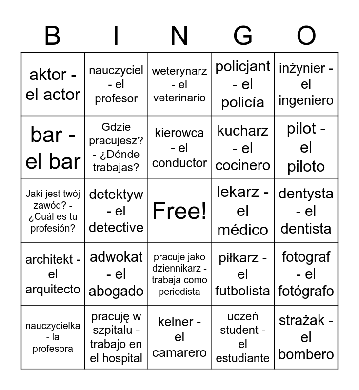 This bingo card has a free space and 41 words: pracować - trabajar, Jaki jest twój zawód? - ¿Cuál es tu profesión?, Co robisz? - ¿Qué haces?, Gdzie pracujesz? - ¿Dónde trabajas?, pracuję w szpitalu - trabajo en el hospital, pracuje jako dziennikarz - trabaja como periodista, kierowca - el conductor, modelka - la modelo, inżynier - el ingeniero, architekt - el arquitecto, detektyw - el detective, policjant - el policía, strażak - el bombero, dentysta - el dentista, lekarz - el médico, adwokat - el abogado, sędzia - el juez, aktor - el actor, aktorka - la actriz, weterynarz - el veterinario, fotograf - el fotógrafo, reżyser filmowy - director de cine, kelner - el camarero, kucharz - el cocinero, fryzjer - el peluquero, sprzedawca - el dependiente, uczeń student - el estudiante, dziennikarz - el periodista, pilot - el piloto, taksówkarz - el taxista, piekarz - el panadero, nauczyciel - el profesor, nauczycielka - la profesora, piosenkarz - el cantante, piłkarz - el futbolista, bar - el bar, restauracja - el restaurante, szpital - el hospital, biuro - la oficina, uniwersytet - la universidad and studiować, uczyć się - estudiar.