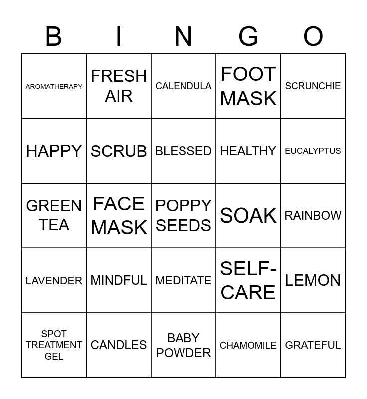 This bingo card has 45 words: ACTIVATED CHARCOAL, POPPY SEEDS, TONER, SPOT TREATMENT GEL, TEA TREE, CHAMOMILE, CALENDULA, SWEET ALMOND OIL, SCRUNCHIE, CANDLES, FOOT MASK, SOAK, MEDITATE, MINDFUL, THANKFUL, BABY POWDER, WHITE FEATHER, GREEN TEA, ROSE, EUCALYPTUS, FRESH AIR, HIMALAYAN, PINK, AROMATHERAPY, DEEP BREATH, RAINBOW, ESSENCE, SKINCARE, SELF-CARE, LAVENDER, BLUSH, LEMON, PEPPERMINT, NUDE, SALT, FACE MASK, ANTI-AGEING, LOVE, GRATEFUL, BLESSED, HAPPY, HEALTHY, BODY BALM, SCRUB and LEMONGRASS.