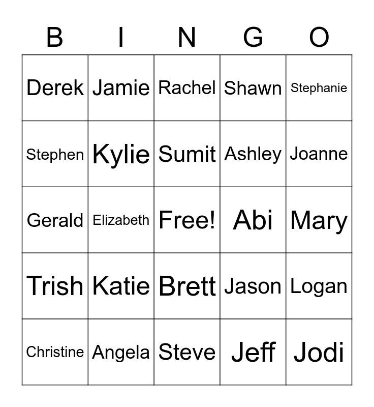 This bingo card has a free space and 42 words: Talia, Sumit, Doreen, Katie, Jeff, Logan, Jodi, Sean, Rachel, Brett, Mary, Joanne, Elizabeth, Stephanie, Mallory, Jason, Tyler, Gerald, Soumiya, Jamie, Stephen, Jessica, Kraig, Derek, Bob, Bekah, Ashley, Gina, Lise, Brittany, Layla, Trish, Kylie, Steve, Vicki, Christine, Angela, Abi, Nikkisha, Elana, Shawn and Qi.