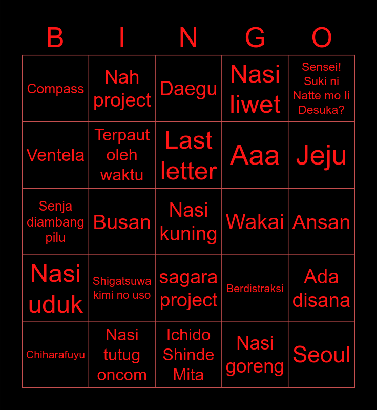 This bingo card has 25 words: Shigatsuwa kimi no uso, Ichido Shinde Mita, Last letter, Chiharafuyu, Sensei! Suki ni Natte mo Ii Desuka?, Compass, Ventela, Nah project, Wakai, sagara project, Aaa, Senja diambang pilu, Berdistraksi, Ada disana, Terpaut oleh waktu, Seoul, Ansan, Daegu, Jeju, Busan, Nasi kuning, Nasi tutug oncom, Nasi uduk, Nasi liwet and Nasi goreng.