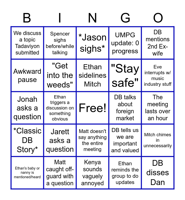 This bingo card has a free space and 24 words: Jarett asks a question, Matt caught off-guard with a question, Ethan sidelines Mitch, Ethan's baby or nanny is mentioned/heard, DB mentions 2nd Ex-wife, We discuss a topic Tadaviyon submitted, Awkward pause, Spencer sighs before/while talking, DB talks about foreign market, Matt doesn't say anything the entire meeting, "Stay safe", Jonah asks a question, DB tells us we are important and valued, Mitch chimes in unnecessarily, "Get into the weeds", Ethan reminds the group to do updates, The meeting lasts over an hour, *Jason sighs*, Eve interrupts w/ music industry stuff, Ethan triggers a discussion on something obvious, DB disses Dan, *Classic DB Story*, UMPG update: 0 progress and Kenya sounds vaguely annoyed.
