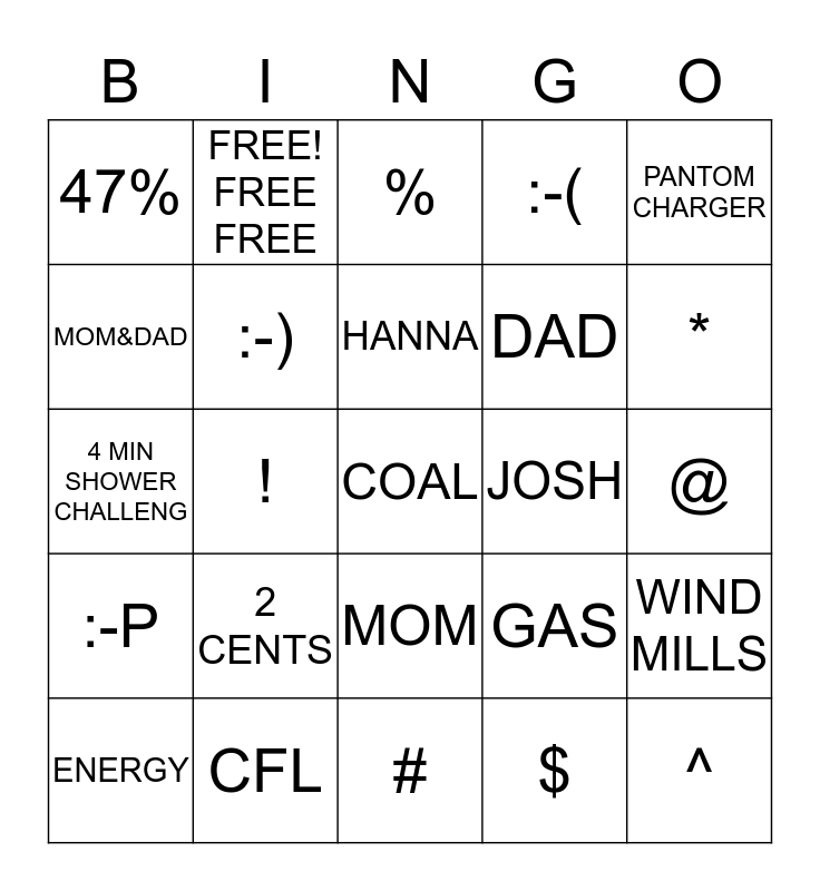 This bingo card has a free space and 24 words: 2 CENTS, CFL, HANNA, ENERGY, PANTOM CHARGER, 47%, MOM&DAD, FREE! FREE FREE, JOSH, MOM, DAD, 4 MIN SHOWER CHALLENG, GAS, WIND MILLS, :-), $, @, %, *, !, ^, :-P, :-( and #.