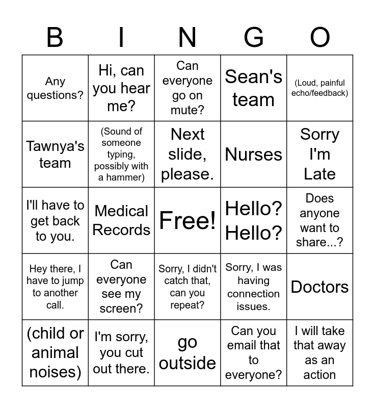This bingo card has a free space and 34 words: Hi, who just joined?, Can you email that to everyone?, ___ , are you there?, Uh, _____, you're still sharing..., Hey there, I have to jump to another call., (Sound of someone typing, possibly with a hammer), (Loud, painful echo/feedback), (child or animal noises), Hi, can you hear me?, No, it's still loading., Next slide, please., Can everyone go on mute?, I'm sorry; I was on mute., (Two people talking)Sorry, go head., Hello?Hello?, Sorry I'm Late, I'm sorry, you cut out there., I'll have to get back to you., Can everyone see my screen?, Sorry, I was having connection issues., Sorry, I didn't catch that, can you repeat?, How is everyone doing?, Any questions?, Does anyone want to share...?, go outside, I will take that away as an action, Sean's team, Voc, Nurses, Tawnya's team, Lisa's team, Medical Records, Doctors and Dr. Berube.
