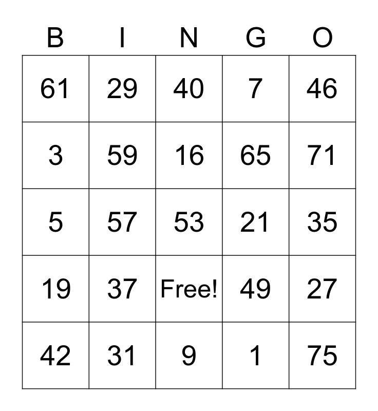 This bingo card has 26 words: Free!, 1, 16, 31, 46, 61, 3, 29, 35, 49, 65, 5, 27, 42, 57, 70, 7, 19, 40, 53, 71, 9, 21, 37, 59 and 75.