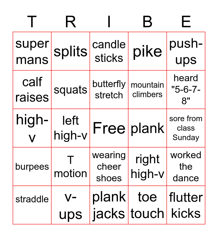 This bingo card has a free space and 34 words: logged into zoom, toe touch, right hurdler, left hurdler, burpees, squats, push-ups, straddle, splits, took a drink of water, butterfly stretch, candle sticks, glute bridges, hollow body, plank, heard "5-6-7-8", v-ups, high-v, T motion, right high-v, wearing cheer shoes, wearing tribe shirt, super mans, sore from class Sunday, plank jacks, flutter kicks, pike, bridge/ backbend, mountain climbers, calf raises, frog jumps, left high-v, worked the dance and shoulder taps.