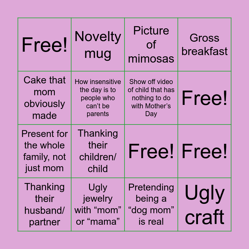 This bingo card has 17 words: Pretending being a “dog mom” is real, Thanking their husband/ partner, Picture of mimosas, Free!, Thanking their children/ child, Gross breakfast, Free!, Show off video of child that has nothing to do with Mother’s Day, Free!, How insensitive the day is to people who can’t be parents, Ugly jewelry with “mom” or “mama”, Free!, Cake that mom obviously made, Novelty mug, Present for the whole family, not just mom, Partner obviously scrambled last minute present and Ugly craft.