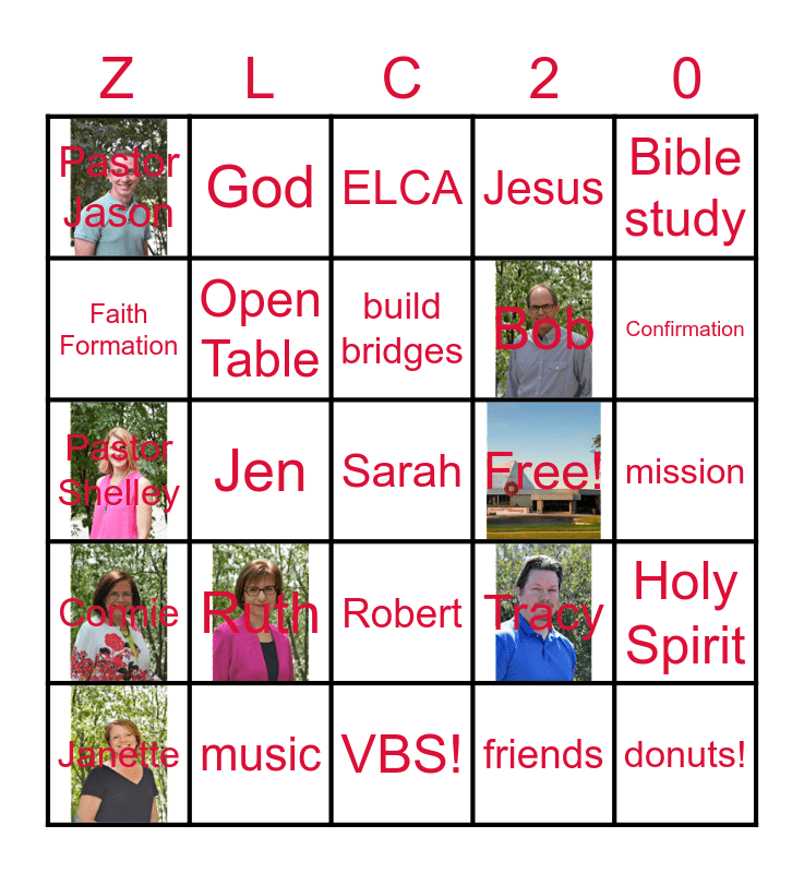This bingo card has 11 images, a free space and 29 words: Janette, Pastor Vern, Jen, Kristy, Pastor Jason, ELCA, Open Table, Ruth, Free!, music, mission, donuts!, VBS!, friends, Confirmation, Worship, Robert, Connie, Bible study, Pastor Shelley, Tracy, Margaret, Bob, Faith Formation, Jesus, God, Holy Spirit, build bridges and Thanks be to God!.