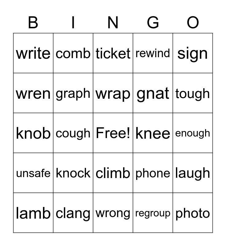 This bingo card has a free space and 25 words: knock, wrong, wrap, lamb, sign, write, wren, comb, knee, climb, gnat, knob, phone, laugh, graph, rough, enough, ticket, tough, cough, photo, clang, unsafe, rewind and regroup.