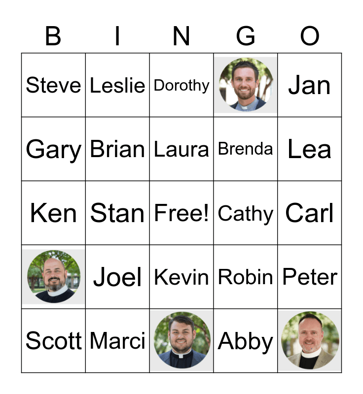 This bingo card has 4 images, a free space and 20 words: Joel, Marci, Laura, Scott, Jan, Steve, Gary, Leslie, Cathy, Kevin, Brenda, Ken, Robin, Peter, Brian, Abby, Carl, Dorothy, Lea and Stan.