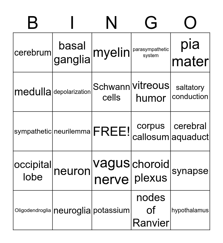 This bingo card has a free space and 24 words: neuron, neuroglia, Schwann cells, Oligodendroglia, pia mater, cerebrum, medulla, basal ganglia, corpus callosum, vagus nerve, vitreous humor, sympathetic, choroid plexus, synapse, depolarization, nodes of Ranvier, cerebral aquaduct, myelin, saltatory conduction, neurilemma, hypothalamus, occipital lobe, parasympathetic system and potassium.
