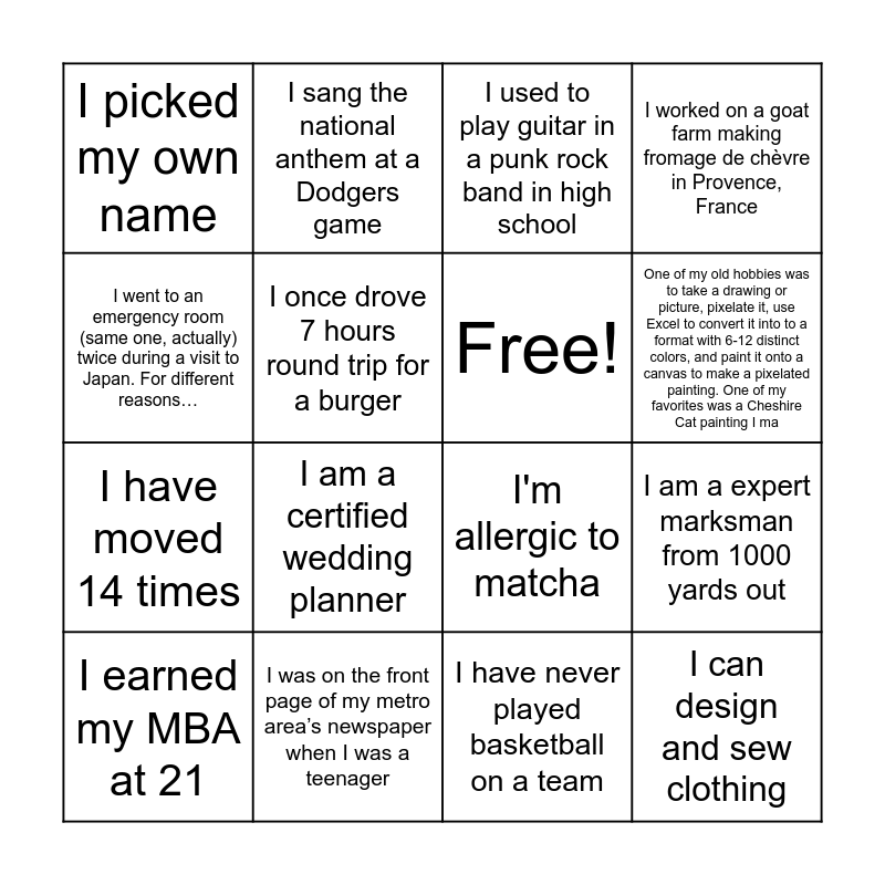 This bingo card has 19 words: I'm allergic to matcha, I've been relocated by Nestle 5 times to 5 different states (Virginia, Utah, New Jersey, Ohio, Washington), I used to play guitar in a punk rock band in high school, I can design and sew clothing, I am a expert marksman from 1000 yards out, I went to an emergency room (same one, actually) twice during a visit to Japan. For different reasons…, I have never played basketball on a team, I picked my own name, I sang the national anthem at a Dodgers game, I have moved 14 times, I am a certified wedding planner, I once drove 7 hours round trip for a burger, Free!, I was on the front page of my metro area’s newspaper when I was a teenager, I earned my MBA at 21, I do aerial silks as a hobby, and I’ve performed in front of audiences too, I worked on a goat farm making fromage de chèvre in Provence, France, One of my old hobbies was to take a drawing or picture, pixelate it, use Excel to convert it into to a format with 6-12 distinct colors, and paint it onto a canvas to make a pixelated painting. One of my favorites was a Cheshire Cat painting I ma and I experiment a little with barrel infusing liquors.