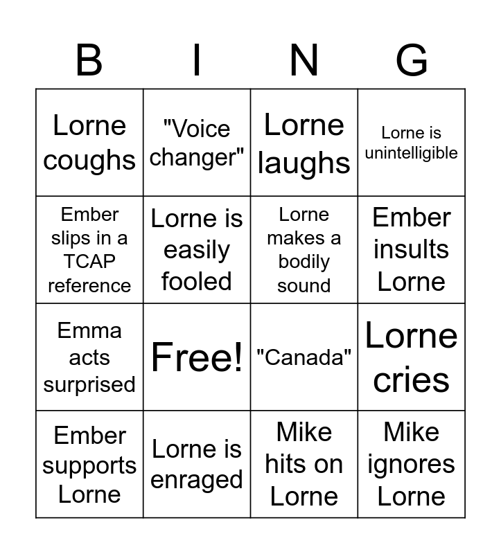 This bingo card has 16 words: Lorne is enraged, Lorne cries, Lorne laughs, Lorne coughs, Emma acts surprised, "Voice changer", "Canada", Mike hits on Lorne, Ember slips in a TCAP reference, Lorne is easily fooled, Ember supports Lorne, Lorne is unintelligible, Free!, Ember insults Lorne, Lorne makes a bodily sound and Mike ignores Lorne.