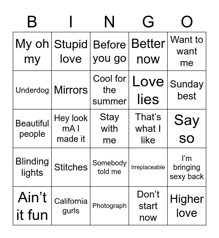 This bingo card has 25 words: Stitches, Photograph, Cool for the summer, Ain’t it fun, Want to want me, My oh my, Underdog, Stupid love, That’s what I like, Somebody told me, Love lies, Beautiful people, Irreplaceable, I’m bringing sexy back, Mirrors, Higher love, Say so, Before you go, Sunday best, Hey look mA I made it, Stay with me, California gurls, Blinding lights, Better now and Don’t start now.