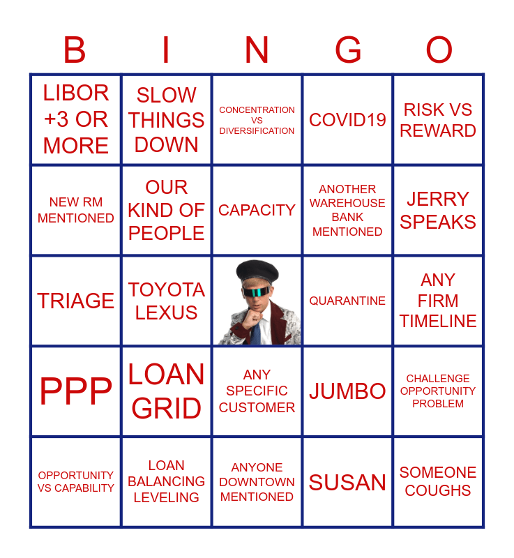 This bingo card has 3 images and 36 words: COUNTRY SAYING, ANY FICO SCORE, OUR KIND OF PEOPLE, OPPORTUNITY VS CAPABILITY, ANY SPECIFIC CUSTOMER, CAPACITY, BALANCE, RISK VS REWARD, PPP, TOYOTA LEXUS, COVID19, ANY FIRM TIMELINE, QUARANTINE, LOAN GRID, New Deals, LIBOR +3 OR MORE, TRUMP, JUMBO, NEW RM MENTIONED, ANYONE DOWNTOWN MENTIONED, ANOTHER WAREHOUSE BANK MENTIONED, JERRY SPEAKS, DOG BARKS, SOMEONE COUGHS, PERSONAL GUARANTY, ADVERSE SELECTION, SLOW THINGS DOWN, "IT'S LIKE", MESSAGING, CONCENTRATION VS DIVERSIFICATION, LOAN BALANCING LEVELING, SUSAN, CEE CEE, CHALLENGE OPPORTUNITY PROBLEM, TRIAGE and LIQUIDITY.