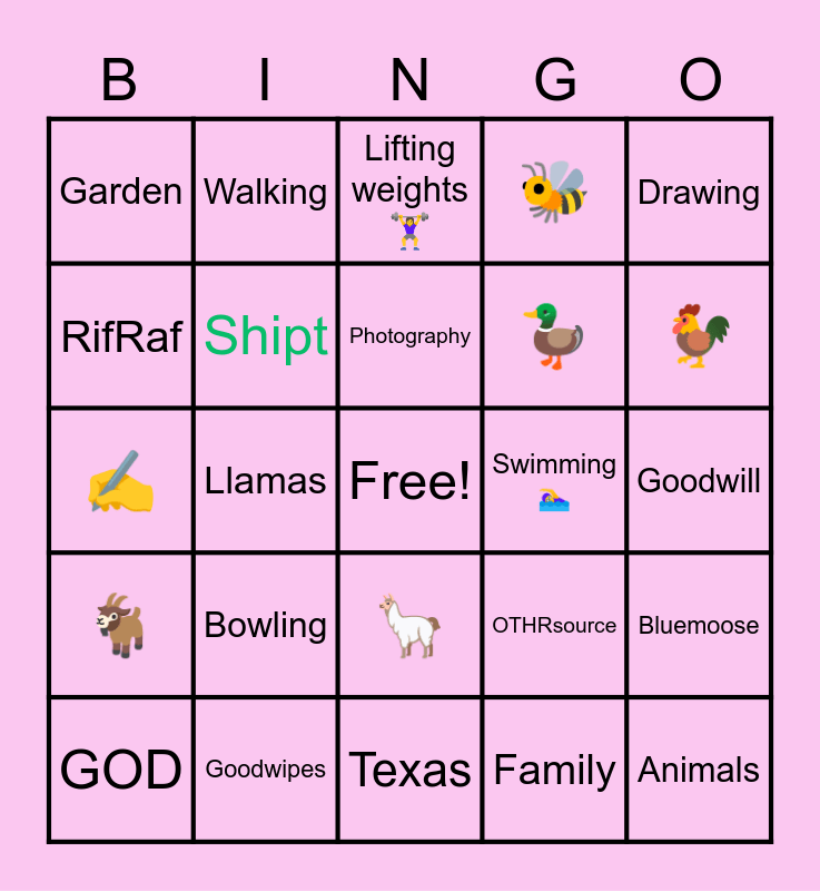 This bingo card has a free space and 24 words: GOD, Bowling, Photography, Family, Drawing, Garden, Walking, Lifting weights 🏋️♀️, Swimming 🏊♀️, Goodwill, ✍️, Shipt, OTHRsource, Bluemoose, RifRaf, Goodwipes, Texas, 🐝, 🐓, 🐐, Llamas, 🦙, 🦆 and Animals.