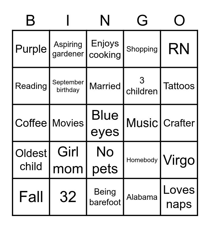 This bingo card has a free space and 24 words: Girl mom, 32, Married, Fall, RN, Purple, Reading, Aspiring gardener, Music, No pets, 3 children, Coffee, Homebody, Virgo, September birthday, Alabama, Crafter, Enjoys cooking, Tattoos, Movies, Loves naps, Oldest child, Shopping and Being barefoot.