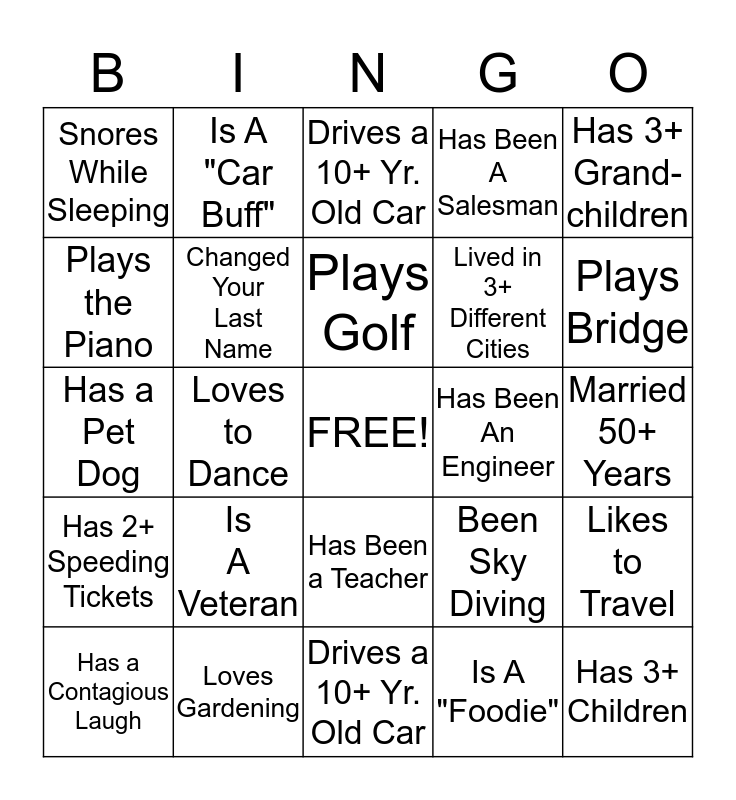 This bingo card has a free space and 24 words: Is A Veteran, Loves Gardening, Plays Golf, Has a Contagious Laugh, Has 3+ Grand- children, Snores While Sleeping, Plays the Piano, Is A "Car Buff", Has Been An Engineer, Has Been a Teacher, Lived in 3+ Different Cities, Has a Pet Dog, Been Sky Diving, Likes to Travel, Changed Your Last Name, Is A "Foodie", Married 50+ Years, Drives a 10+ Yr. Old Car, Plays Bridge, Loves to Dance, Has 3+ Children, Has 2+ Speeding Tickets, Has Been A Salesman and Drives a 10+ Yr. Old Car.