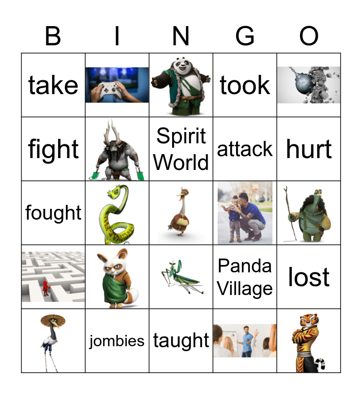 This bingo card has 16 images and 13 words: take, jombies, taught, hurt, fought, Panda Village, Jade Palace, attack, fight, took, lost, Spirit World and frightened.