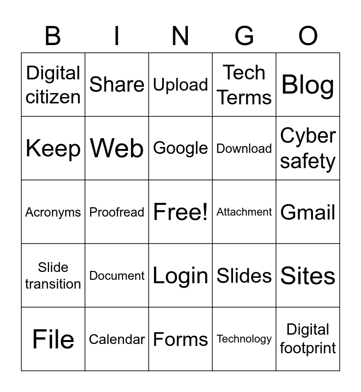 This bingo card has a free space and 24 words: File, Document, Google, Technology, Blog, Digital citizen, Share, Upload, Attachment, Gmail, Acronyms, Web, Slides, Sites, Keep, Calendar, Forms, Tech Terms, Cyber safety, Slide transition, Proofread, Login, Download and Digital footprint.