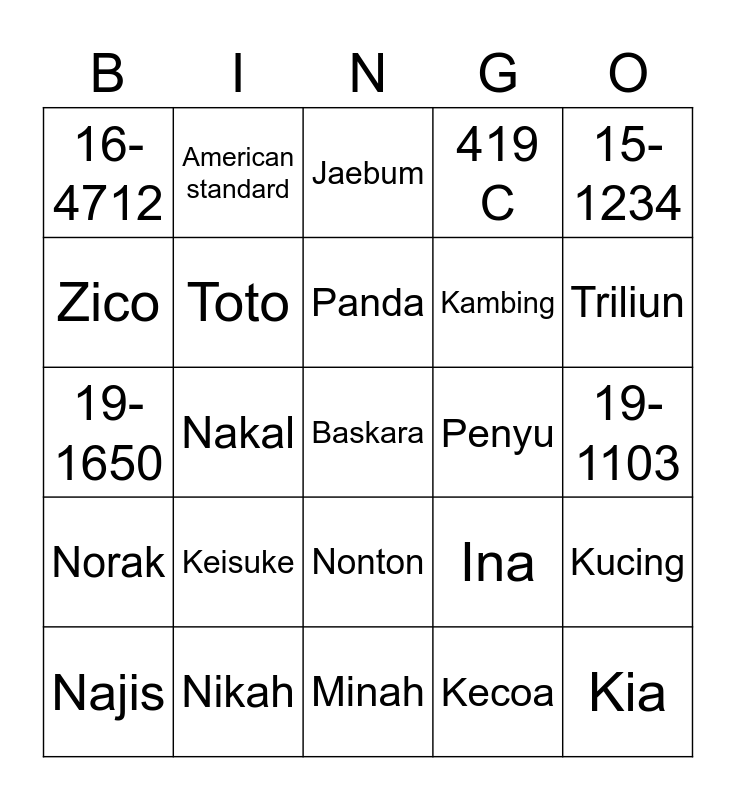 This bingo card has a free space and 24 words: Keisuke, Nikah, Panda, Najis, 15-1234, 16-4712, Zico, American standard, Penyu, Nonton, Kambing, 19-1650, Ina, Kucing, Toto, Kecoa, 19-1103, Jaebum, Triliun, Nakal, Kia, Norak, 419 C and Minah.