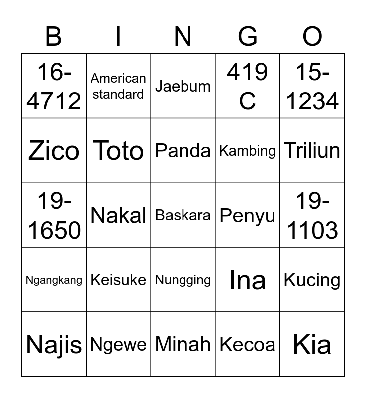 This bingo card has a free space and 24 words: Keisuke, Ngewe, Panda, Najis, 15-1234, 16-4712, Zico, American standard, Penyu, Nungging, Kambing, 19-1650, Ina, Kucing, Toto, Kecoa, 19-1103, Jaebum, Triliun, Nakal, Kia, Ngangkang, 419 C and Minah.